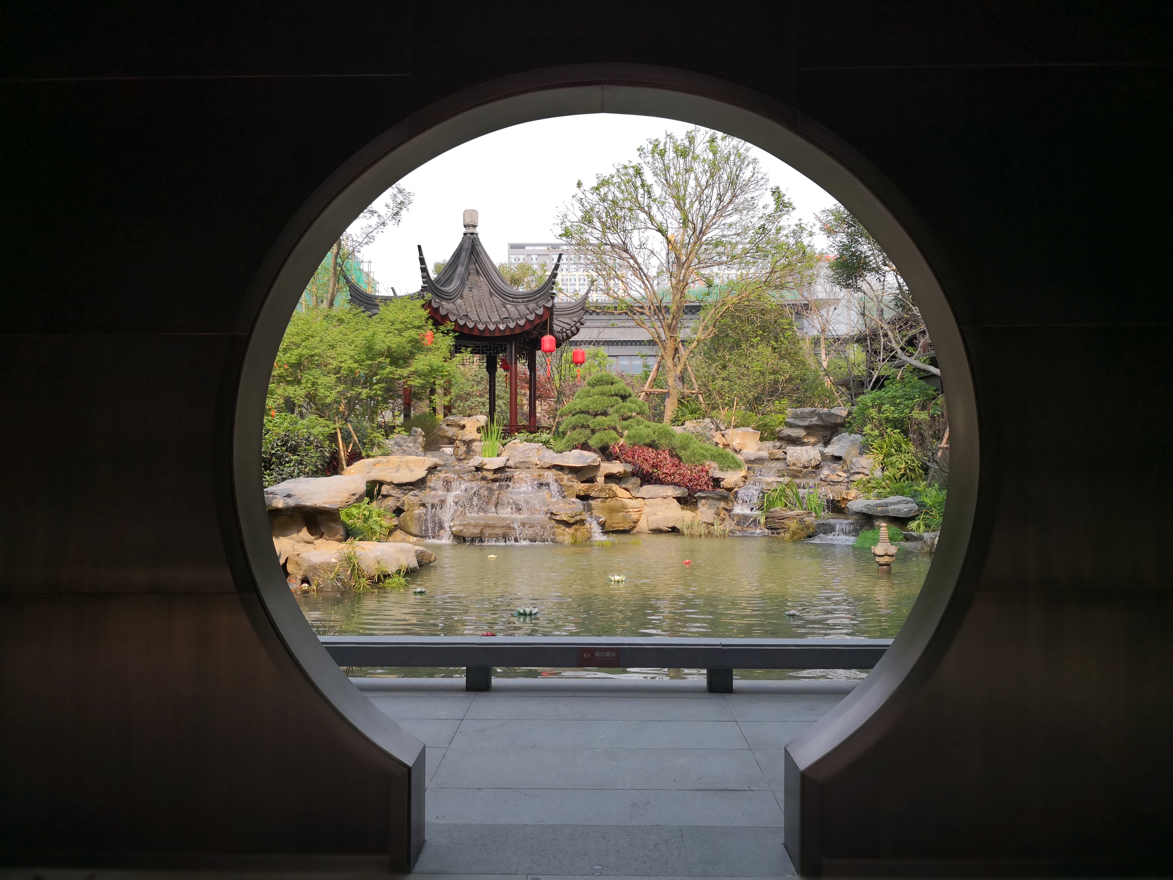 一颗苍劲挺拔的黑松屹立于叠水之上