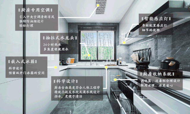 无论你身处客厅的任何位置,都能对老人孩子的状态一目了然。电视背景墙后方空间半开放式设计,父母在客厅看电视,妻子丈夫陪同孩子在半开放式书房或玩具室玩耍,一墙之隔双面空间。可轻松容纳四人以上的墅级厨房,专属孩子的儿童套房……生活就是应该这样。