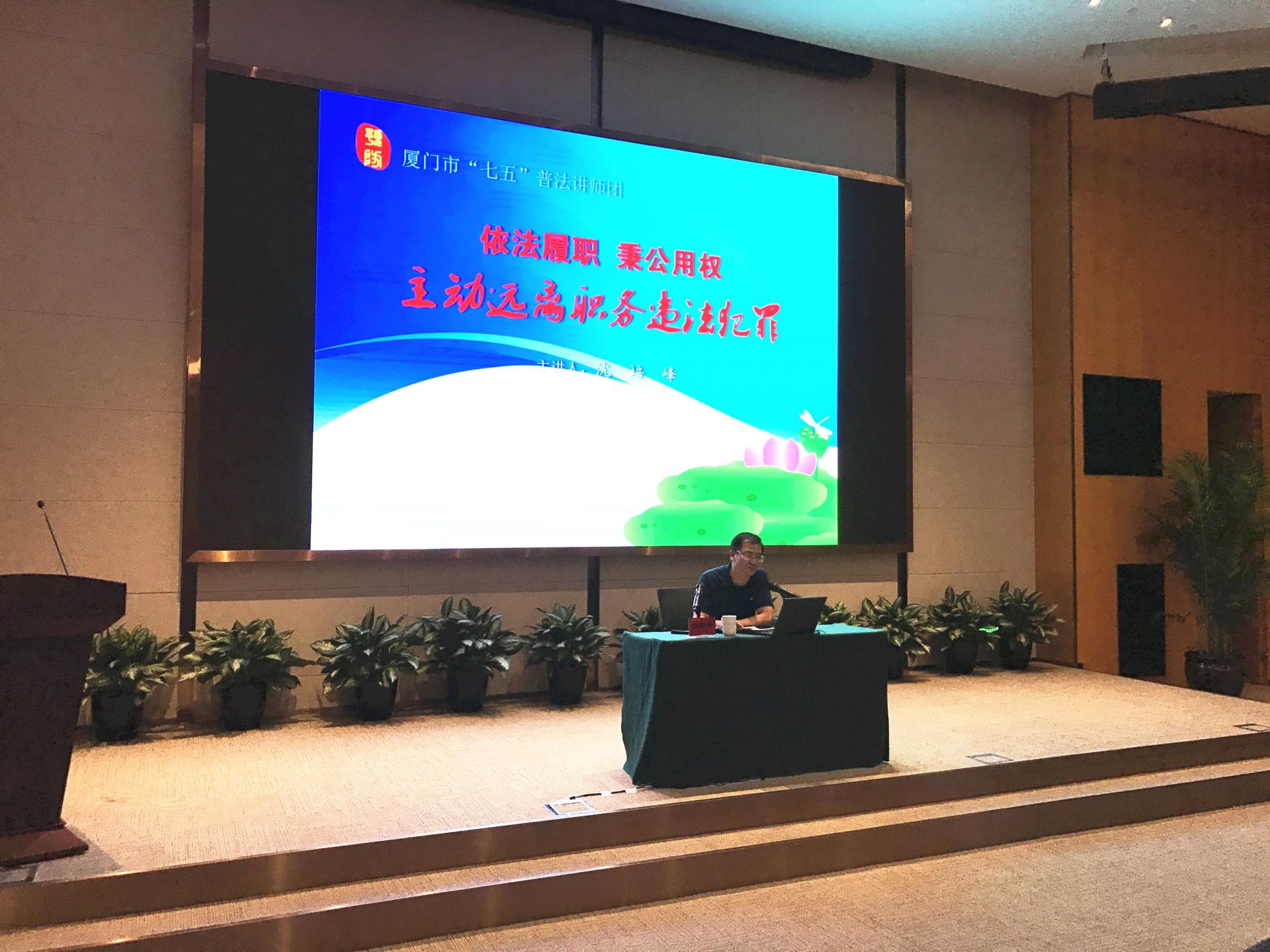 本次讲座由厦门市纪委宣传部副部长沈培峰主讲,沈部长以“依法履职,秉公用权——主动远离职务违法犯罪”为题,从反腐败查办案件基本情况、分领域政治精准反腐启示、职务违法犯罪的预防建议等方面,结合实际案例,对职务犯罪造成的危害进行深刻剖析。沈部长认为,远离职务犯罪要以案为鉴,谨记犯罪风险;抓早抓小,注重防微杜渐;排查风险,突出预防重点。